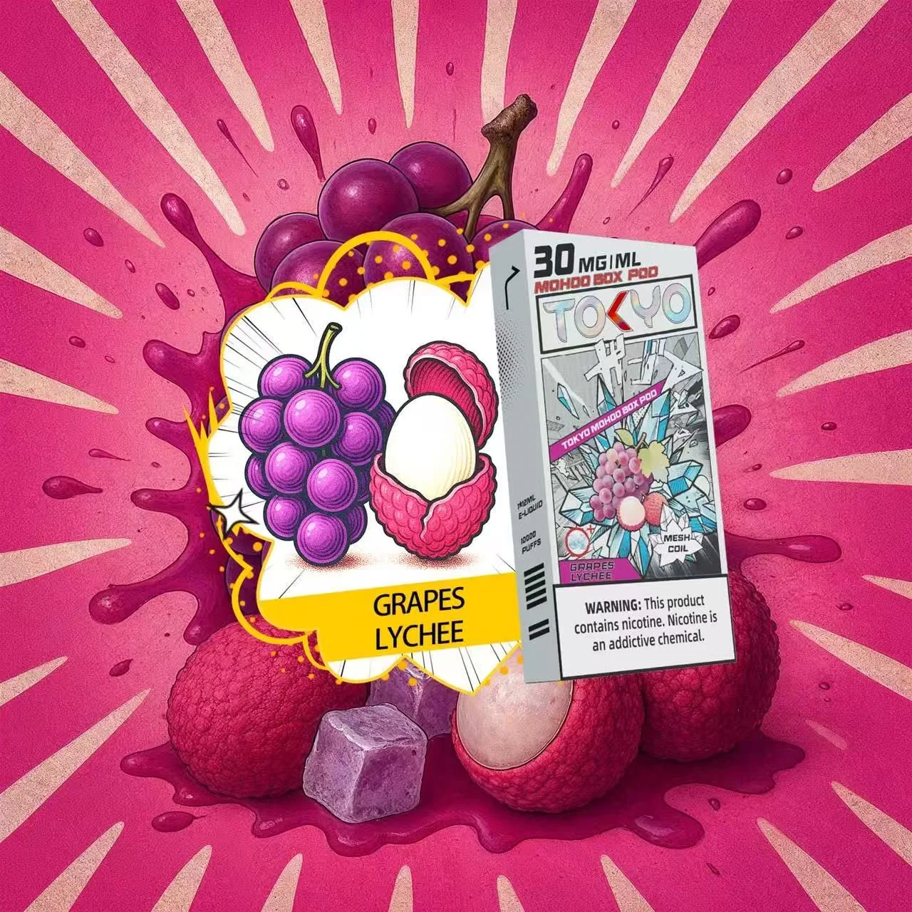 東京魔盒電子煙煙彈採用植物甘油與丙二醇基底,搭配高純度尼古丁鹽,容量 12 mL、尼古丁強度 30 mg/mL(3%),搭載 1.0Ω 鋼網棉霧化芯,設計為一次性 pod,約 10,000 口吸引力持久。